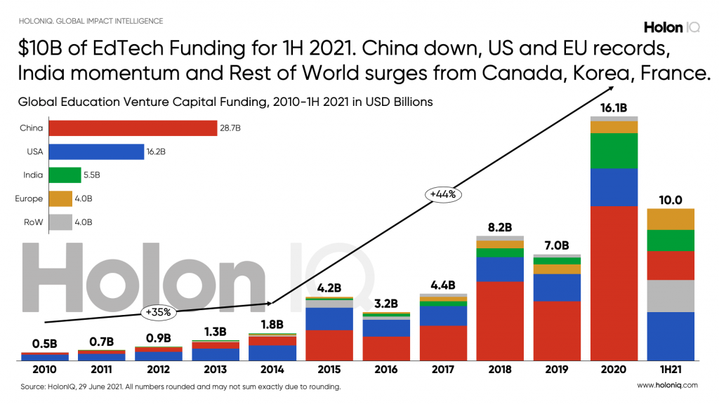 My batting average aside, the COVID crisis exposed a real need for educational alternatives. This spurred increased investment in edtech startups over the last year with edtech funding reaching a peak in 2021 with $16B invested. H1 2021 is on pace to beat that.